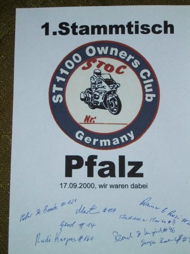 Am 17.9.2000 war es soweit. Das erste Treffen, welches schließlich zur Gründung des STOC Saar-Pfalzes führen sollte, fand statt. Zunächst wurde der Stammtisch als Stammtisch der Pan Fahrer in der Pfalz bei Peter #1 registriert. Später wurde er zu STOC Chapter Saar-Pfalz umbenannt, da sich ja hier nun die Pan Fahrer aus der Pfalz und dem Saarland regelmäßig trafen und auch heute noch treffen. Auch heute, nach jetzt demnächst 13 Jahren, erfreut sich der Stammtisch immer noch reger Teilnahme, welches auch durch Besuche unserer Nachbarn aus Hessen oder Norddeutschland zeigt.